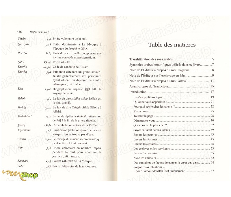 Profite de ta vie ! Se sont des mots sortant tout droit de mon cœur, espérant trouver leur place dans le vôtre. C'est celui de mes livres que j'aime e plus et qui m'est le plus cher. Je demande à Allah d'en faire bénéficier d'autres, de faire de cet effort une dévotion complète à Lui de récompenser amplement tous ceux qui ont contribué à le transmettre. »